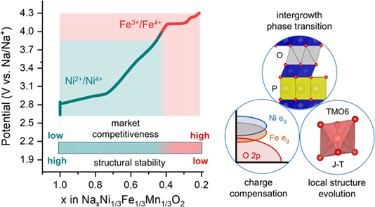 Abstract: Extending the depth-of-charge (DoC) of the layered oxide cathode presents an essential route to improve the competitiveness of the Na-ion battery versus the commercialized LiFePO4-based Li-ion battery (0.8 CNY/Wh). However, the DoC-dependent boundary between detrimental/irreversible structural distortion and neutral/reversible structure interconversion cannot be clearly distinguished, which is attributed to the ambiguous recognition of correlation among the complex phase transition, local covalent environment evolution, and charge compensation. Herein, to bridge the above gap, we employed O3-NaNi1/3Fe1/3Mn1/3O2 as the prototype cathode and extended the target DoC from typical Na0.4 (∼125 mAh/g, 4.0 V cutoff) to Na0.2 (∼180 mAh/g, 4.3 V cutoff). Regarding phase transition and charge compensation, the O3-to-P3 phase transition occurs before moderate Na0.4-DoC (Fe/Mn redox silence, Ni oxidation dominated), while further desodiation (start from Na0.4) induces a P-to-O slab transition, resulting in the coexistence of P3 and OP2 phases and subsequent OP2/O3 intergrowth phases at higher DoC (Na0.2), upon which the Fe3+-to-Fe4+ oxidation is activated for capacity contribution. The local covalent environment presents severer deviation at high DoC (merely 0.2 mol desodiation from Na0.4 to Na0.2), which can be attributed not only to the slab gliding induced by the P-to-O slab transition but also to the further aggravation caused by the Jahn–Teller distortion of the FeO6 octahedron. Such irreversible distortion of the local covalent environment would be accumulated and evolved/deteriorated into structural degradation during long-term cycling. Furthermore, the rate-dependent artificial regulation of redox process has been demonstrated and the doping strategy toward structural stabilization has been proposed.