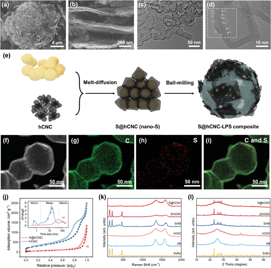 Abstract: All-solid-state lithium-sulfur batteries (ASSLSBs) have garnered widespread attention due to their advantages of high energy density and enhanced safety. However, the typical composite structure composed of solid-state electrolyte (SE), discrete conducting carbon black, and microsized sulfur (μ-S) with long-range Li+/e− conducting path and huge volume changes, suffers from sluggish charge transport and severe electrochemical-mechanical failure. In this work, a unique hierarchical carbon nanocage (hCNC) is applied as a continuous conducting network where nanosized sulfur are confined. Due to the synergistic effects of multi-dimensional (particle, interface, and electrode) structural engineering, this new sulfur-carbon composite cathode (S@hCNC39) can achieve uniform distribution of sulfur and carbon, and efficiently constructs triple-phase interfaces, showing enhanced charge-carrier transport and improved electrochemical-mechanical stability. Remarkable cycling performance of 89% after 300 cycles at 0.2 C at 30 °C is realized in ASSLSBs assembled with S@hCNC39. Notably, ASSLSBs achieve an ultrahigh areal capacity of 9.95 mAh cm−2 with stable cycling at 60 °C with high sulfur contents of 40% and high sulfur loadings of 6 mg cm−2. These results provide critical insights into the design of rational sulfur-carbon composites and offer a viable approach to enhance the overall performance of ASSLSBs.