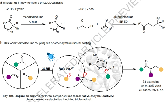 Abstract: Multicomponent reactions – those where three or more substrates combine into a product – have been highly useful in rapidly building chemical building blocks of increased complexity4, but achieving this enzymatically has remained rare.5 This limitation primarily arises because an enzyme’s active site is not typically set up to address multiple substrates, especially in cases involving multiple radical intermediates6. Recently, chemical catalytic radical sorting has emerged as an enabling strategy for a variety of useful reactions7,8. However, making such processes enantioselective is highly challenging due to the inherent difficulty in the stereochemical control of radicals9. Here, we repurpose a thiamine-dependent enzyme10,11 through directed evolution, combine it with photoredox catalysis, to achieve a photobiocatalytic enantioselective three-component radical cross-coupling. This approach combines three readily available starting materials — aldehydes, α-bromo-carbonyls and alkenes — to give access to enantioenriched ketone products. Mechanistic investigations provide insights into how this dual photo-/enzyme system precisely directs the three distinct radicals involved in the transformation, unlocking new enzyme reactivity. Our approach has achieved exceptional stereoselectivity, with 25 out of 33 examples achieving ≥97% enantiomeric excess.