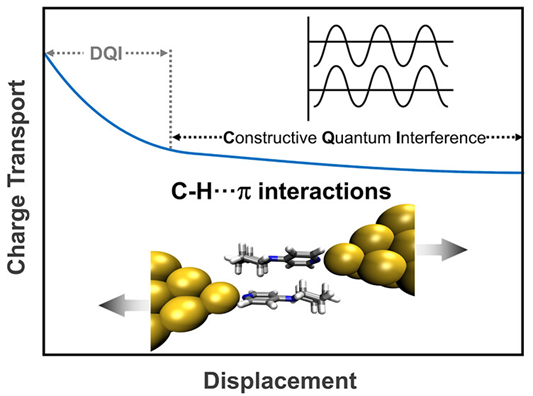 Abstract: C–H···π interactions, a prevalent intermolecular force, play a pivotal role in chemistry, materials science, and life sciences. Despite extensive studies of their influence on intermolecular binding configurations and energetics, their impact on intermolecular coupling and charge transport remains unexplored. Here, we investigate the charge transport within supramolecular junctions connected by C–H···π and π–π interactions, respectively, and find that C–H···π interactions exhibit conductances that are 3.5 times those of π–π interactions. Angstrom-scale distance-dependent experiments indicate that the conductance of C–H···π supramolecular junctions experiences initial decay under stretching, followed by gradual convergence, in contrast with the periodic fluctuations in π–π stacked supramolecular junctions. Theoretical calculations show that charge transport within C–H···π interactions transitions from destructive to constructive quantum interference under stretching, with a larger range of constructive quantum interference compared with π–π stacking. This study establishes that C–H···π interactions facilitate efficient intermolecular charge transport and elucidates the evolution of quantum interference effects with assembly configuration, offering critical insights for the design of supramolecular materials and devices.