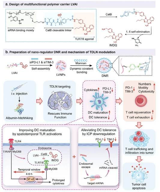 Abstract: Lymph nodes are crucial immune foci as the primary target for cancer immunotherapy. However, the anti-tumor functions of tumor-draining lymph nodes (TDLNs) are critically suppressed by tumors. Here, a novel spatiotemporal nano-regulator is presented, designed to modulate the dendritic cells (DCs) in TDLNs, establishing a supportive niche for immune surveillance. The DC-mediated nano-regulator (DNR) is established by the self-assembly of an imidazoquinoline (IMDQ) prodrug, inhibitory immune checkpoint (ICP) siRNA, and mannan (a TLR4 agonist). This unique design leverages the spatiotemporal activation of TLR4 and TLR7/8, thereby optimizing DC maturation and cytokine production. This further promotes efficient T cell priming. Simultaneously, the ICP-targeting siRNA mitigates the tolerogenic effects induced by tumor-derived factors and TLR activation, preventing T cell exhaustion. In essence, DNR facilitates potent remodeling of TDLNs and the tumor microenvironment, activating the anti-tumor immunity cascade. When combined with vaccines, DNR greatly promotes tumor regression and the establishment of long-term immunological memory.
