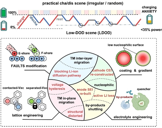 Abstract: More and more basic practical application scenarios have been gradually ignored/disregarded, in fundamental research on rechargeable batteries, e.g. assessing cycle life under various depths-of-discharge (DODs). Herein, although benefit from the additional energy density introduced by anionic redox, we critically revealed that lithium-rich layered oxide (LRLO) cathodes present anomalously poor capacity retention at low-DOD cycling, which is essentially different from typical layered cathodes (e.g. NCM), and pose a formidable impediment to the practical application of LRLO. We systemically demonstrated that DOD-dependent capacity decay is induced by the anionic redox and accumulation of oxidized lattice oxygen (On−). Upon low-DOD cycling, the accumulation of On− and the persistent presence of vacancies in the transition metal (TM) layer intensified the in-plane migration of TM, exacerbating the expansion of vacancy clusters, which further facilitated detrimental out-of-plane TM migration. As a result, the aggravated structural degradation of LRLO at low-DOD impeded reversible Li+ intercalation, resulting in rapid capacity decay. Furthermore, prolonged accumulation of On− persistently corroded the electrode-electrolyte interface, especially negative for pouch-type full-cells with the shuttle effect. Once the “double-edged sword” effect of anionic redox being elucidated under practical condition, corresponding modification strategies/routes would become distinct for accelerating the practical application of LRLO.