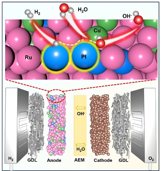 Abstract: As one of the best candidates for hydrogen oxidation reaction (HOR), ruthenium (Ru) has attracted significant attention for anion exchange membrane fuel cells (AEMFCs), although it suffers from sluggish kinetics under alkaline conditions due to its strong hydroxide affinity. In this work, we develop ternary hollow nanocages with Pt epitaxy on RuCu (Pt-RuCu NCs) as efficient HOR catalysts for application in AEMFCs. Experimental characterizations and theoretical calculations confirm that the synergy in optimized Pt8.7-RuCu NCs significantly modifies the electronic structure and coordination environment of Ru, thereby balancing the binding strengths of H* and OH* species, which leads to a markedly enhanced HOR performance. Specifically, the optimized Pt8.7-RuCu NCs/C achieves a mass activity of 5.91 A mgPt+Ru−1, which is ~3.3, ~2.2, and ~15.0 times higher than that of RuCu NCs/C (1.38 A mgRu−1), PtRu/C (1.83 A mgPt+Ru−1) and Pt/C (0.37 A mgPt−1), respectively. Impressively, the specific peak power density of fuel cells reaches 15.9 W mgPt+Ru−1, significantly higher than those of most reported PtRu-based fuel cells.