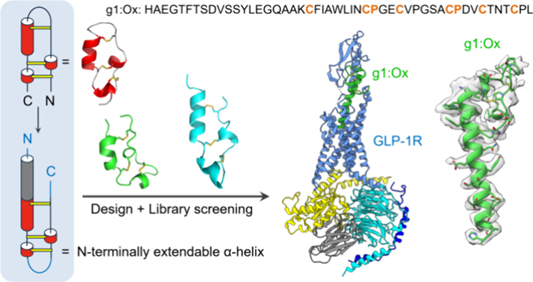 Abstract: Many peptide hormones adopt long α-helical structures upon interacting with their cognate receptors but often exhibit flexible conformations when unbound. Strategies that can stabilize long α-helices without disrupting their binding to receptors are still lacking, which hinders progress in their biological applications and drug development. Here, we present an approach that combines rational design with library screening to create and identify a unique disulfide-directed multicyclic peptide (DDMP) scaffold, which could effectively stabilize N-terminally extendable α-helices while displaying exceptional efficiency in disulfide pairing and oxidative folding. This DDMP scaffold was then utilized for stabilizing the α-helical structure of glucagon-like peptide-1 (GLP-1), resulting in a potent GLP-1 receptor (GLP-1R) agonist with a significantly improved α-helicity and proteolytic stability. By incorporating external α-helices into the DDMP scaffold, we can effectively preserve the native N-terminal α-helical structures while allowing for extensive evolution of the C-terminal disulfide-rich domain for enhancing target binding, as demonstrated by the generation of the DDMP-stabilized GLP-1 (g1:Ox). The cryo-electron microscopy structure of the g1:Ox–GLP-1R in complex with heterotrimeric Gs reveals the molecular basis for the potent binding between g1:Ox and GLP-1R. Specifically, the DDMP moiety establishes additional interactions with the extracellular domain of GLP-1R, which are absent in the case of GLP-1. Thus, this work offers a novel and effective approach for engineering therapeutic peptides and other peptide α-helices, ensuring that both the N- and C-terminal regions remain essential for target recognition and activation.