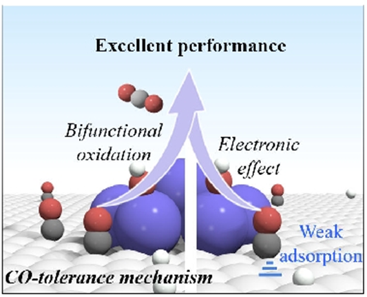 Abstract: The presence of trace CO impurity gas in hydrogen fuel can rapidly deactivate platinum-based hydrogen oxidation reaction (HOR) catalysts due to poisoning effects, yet the precise CO tolerance mechanism remains debated. Our designed Au@PtX bifunctional core-shell nanocatalysts exhibit excellent performance of CO tolerance in acidic solution during HOR and possess exceptional Raman spectroscopy enhancement. Through capturing and analyzing in situ Raman spectroscopy evidences on *OH, metal-O species and *CO evolution under 0.3 V, we confirm that oxygen-containing species on PtRu and PtSn catalysts promote the oxidation and desorption of *CO. While Ru enhances *CO adsorption on Pt, the primary CO tolerance performance of PtRu arises from *CO oxidation via a bifunctional pathway. Additionally, electronic structure of Sn reduces *CO adsorption on Pt sites, complementing the bifunctional mechanism to further enhance the CO tolerance performance of PtSn. These discoveries significantly deepen our understanding of the anti-poisoning mechanism of Pt-based catalysts in the HOR process and offer valuable insights for rational catalyst design.