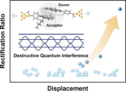 Abstract: Inspired by the initial proposal of σ-bridged donor–acceptor (D-σ-A) single-molecule diodes in 1974, extensive studies over the past 50 years have explored various designs for π-conjugated D-π–A single-molecule diodes due to their feasible chemical synthesis and effective charge transfer. However, the rectification ratio of π-conjugated single-molecule diodes has been long-term limited by the challenge of asymmetric electronic coupling to induce the rectification effect. Here, we present a supramolecular diode constructed through an intramolecular π–π interaction-driven assembly strategy. The asymmetric transmission in this system is tunable via subangström mechanical control, resulting in a rectification ratio of up to 16. Electron transport studies reveal that this through-space D-π–π–A system constructed by the π–π stacking between pyrene (Py) and naphthalenediimide (NDI) is crucial for achieving asymmetric currents under different bias polarization. Theoretical calculations suggest that the intermolecular destructive quantum interference not only enables a sharp variation in electron transmission but also facilitates asymmetric electronic energy shifts through mechanical stretching, significantly improving the rectification ratio. Our work provides a general approach to fabricating and modulating asymmetric molecular architectures through noncovalent supramolecular interactions, showcasing the potential of high-performance single-molecule rectifiers.