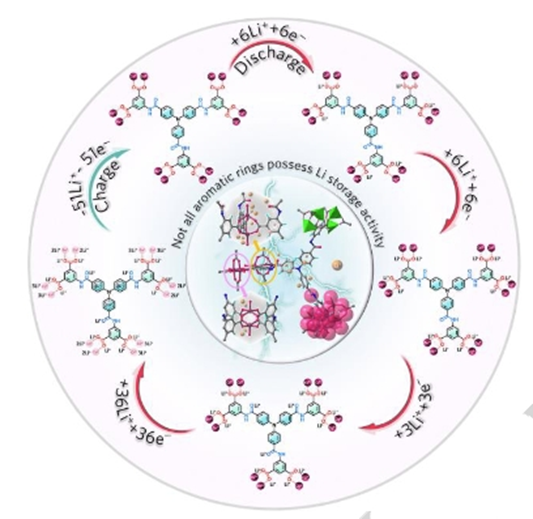 Abstract: Metal-organic frameworks (MOFs) are considered promising candidates for anode materials in Li-ion batteries (LIBs) owing to their designable structure, abundant active sites, and well-organized porosity. However, the structural factors governing active site utilization and Li-ion storage kinetics remain inadequately understood. In particular, the Li-ion storage behaviors of aromatic rings with high LUMO energy levels and situated in varying chemical environments remain a highly debated issue. Herein, a new cobalt-based MOF (Co-NTTA, NTTA ligand: 5,5′,5″-((4,4′,4″-nitrilotris(benzoyl))tris-(azanediyl))triisophthalic acid), featuring aromatic rings situated in diverse local environments, is deliberately designed and synthesized. Experimental characterizations and first-principles calculations have verified the occurrence of a reversible electrochemical reaction involving a total of 51 electrons among the NTTA ligands, cobalt cations, and Li+ ions. Unlike the traditional concept of superlithiation, the three inner aromatic rings are selectively activated by π-aromatic conjugation networks and π···π stacking, contributing to a reversible 6-electron pseudocapacitive Li+ intercalation reaction. Conversely, the three outer aromatic rings remain inert toward Li+ ions. Impressively, the Co-NTTA MOF anode, with selectively activated aromatic rings, delivers a reversible capacity of up to 956 mAh g−1 at 200 mA g−1 and demonstrates exceptional high-rate durability, further supporting a 4.3 V lithium-ion hybrid electrochemical capacitor with high energy/power density.