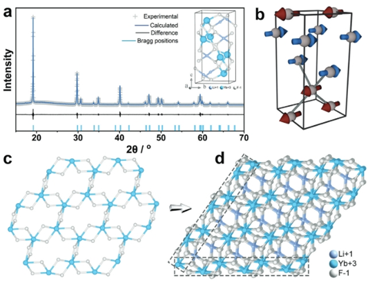 Abstract: Adiabatic demagnetization refrigeration, which utilizes the magnetocaloric effect of magnetic refrigerants, stands as the sole cooling technology capable of achieving sub-Kelvin temperatures efficiently and reliably without relying on scarce 3He resources or gravity. However, current sub-Kelvin magnetic refrigerants encounter challenges such as structural instability in vacuum or under mild heating, along with small magnetic entropy change (−ΔSm) values, which significantly limit their practical applications. Here a water-free magnetic refrigerant, LiGd0.1Yb0.9F4 is reported, prepared by introducing Li⁺ ions to reduce the dipolar interactions between Gd3+ ions and/or Yb3+ ions. Notably, this refrigerant possesses a magnetic ordering temperature of 85 mK, while its experimental −ΔSm reaches up to 136 mJ cm−3 K−1 (0.68 K and 2 T), more than three times the theoretical value of CrK(SO4)2·12H2O. Significantly, this refrigerant not only cools the test sample to temperatures as low as 160 mK but also achieves a specific cooling capacity of 46.943 mJ cm−3 T−1 at 300 mK. Remarkably, the specific cooling capacity at 300 mK is more than double that of commercial CrK(SO4)2·12H2O, representing one of the most notable values reported among all known magnetic refrigerants operating at sub-Kelvin temperatures.
