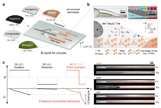 Abstract: The critical challenge in advancing liquid metal circuits (LMCs) lies in achieving interfacial compatibility with diverse substrates while dynamically balancing fabrication efficiency and quality to ensure robust conductive stability. Here we introduce an electrochemical redox synergistic liquid metal (E-rsLM) that enables the controllable generation of diverse intermetallic bond transition layers (Cu, Au, or Fe-based) between liquid metal and unrestricted substrate surfaces, applicable in pH-universal electrolytes. It involves enhanced locomotion of the liquid metal, driven by synergistic electrochemical energy transduction from cyclic changes in gallium redox states. Characterized by expansion-contraction-expansion, it enables unique self-propelled bouncing, tuning spreading speed (up to ~26.8 mm/s) and elongation rate (up to 1192 %) with a volume of only 80 μL. Additionally, we demonstrate the adaptability of E-rsLM fabrication across 30 different substrates, highlighting its versatility. The patterning displays the superimposed efficiency and self-indicated quality, leading to superior conductivity (with time-cost savings of 30.7 % and 13.4 % in heating-cooling cycles, and a nearly 90 % reduction in output resistance). The practical viability of these circuits is further showcased by the assembly of integrated circuits, marking a significant step in expanding LMCs applications beyond laboratory-scale prototypes.