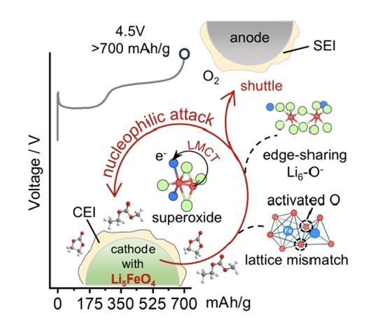 Abstract: Developing sacrificial cathode prelithiation technology to compensate for irreversible lithium loss is crucial for enhancing the energy density of lithium-ion batteries. Antifluorite Li-rich Li5FeO4 (LFO) is a promising prelithiation agent due to its high theoretical capacity (867 mAh/g) and superior decomposition dynamic (< 4.0 V versus. Li/Li+). However, the oxygen evolution mechanism in LFO remains unclear, limiting its application as an ideal prelithiation agent. Herein, we systematically track the full lifecycle oxygen footprint in LFO lattice, electrolyte and solid electrolyte interface (SEI). We demonstrate the lattice mismatch induced by the quasi-disorder rocksalt intermediate phase can activate the lattice oxygen oxidation promoting the dimerization to O2. Specifically, in contrast to the O-O dimers formed within typical anionic-redox active cathodes, the oxidation of lattice oxygen in LFO generates O- stabilized in Li6-O configuration. Significantly, a pair of edge-sharing Li6-O configurations transforms into a superoxo dimer, which further evolves into O2 via a ligand-to-metal charge transfer process. Moreover, we demonstrate that nucleophilic intermediates threaten the stability of electrolytes and SEI. Leveraging the insights above, we offer comprehensive perspectives for the modification of ideal prelithiation agents.
