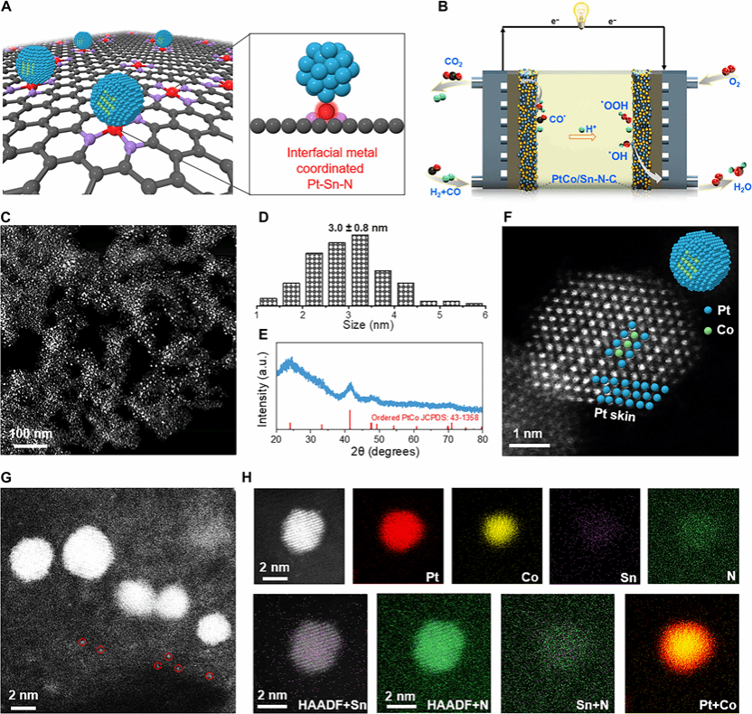 Abstract: Platinum (Pt) has been documented as the top-tier fuel cell catalyst, yet it faces a notable challenge regarding its poor CO tolerance and sluggish oxygen reduction reaction (ORR) in proton exchange membrane fuel cells (PEMFCs), particularly when using CO-contaminated blue and gray H2. Here, we present an interfacial metal coordination strategy to design a bifunctional platinum-cobalt (PtCo) intermetallic catalyst integrated with a tin-nitrogen-carbon (Sn–N–C) support, which forms Pt–Sn–N bonds that substantially boost both ORR activity and CO tolerance. The PtCo/Sn–N–C-made fuel cell achieves a topmost peak power density of 2.11 watts per square centimeter in 100 parts per million (ppm) of CO-containing H2, surpassing all previously reported PEMFCs. In addition, it operates stably at a rated voltage for over 710 hours in 100 ppm of CO/H2-air. This work demonstrates the feasibility of fuel cells directly using CO-contaminated gray & blue H2, paving the way for PEMFC-driven energy vehicles.