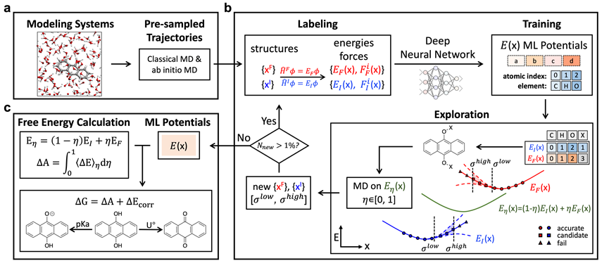 在这项工作中,为了实现复杂溶剂化环境中氧化还原电位和酸度常数的计算,通过构建自动化工作流软件ai2-kit,实现并行学习和自由能计算方法的结合,高效准确计算自由能计算机器学习势函数。进一步通过纳秒级别第一性原理精度的机器学习分子动力学(machine learning molecular dynamics,MLMD)模拟实现酸度常数和氧化还原电位计算。为了提升氧化还原电位的计算精度,引入杂化泛函HSE06结合工作流自动化构建势函数,进行MLMD自由能计算,获得高精度计算结果。该工作为后续电解液高通量计算和智能设计奠定了理论基础。