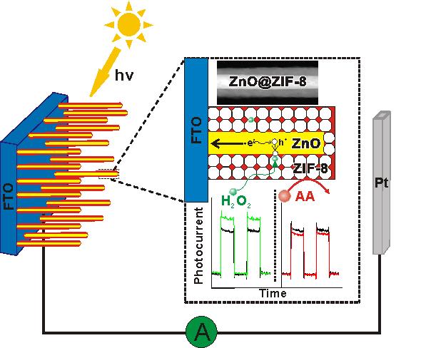 众所周知,作为金属氧化物半导体的代表材料之一,ZnO在传感、光电、压电等方面都展现出极为优异的性能;而MOFs作为多孔晶态材料具有规则孔道以及高的孔隙率,在气体存储和分离以及催化等方面都有很好的潜在应用。该团队以ZnO纳米棒为模板,通过控制Zn2+的缓释及其与2-甲基咪唑的配位作用,形成核壳结构的ZnO@ZIF-8的纳米复合材料。该方法避免了传统合成方法中MOFs在模板之外成核的弊端。更有意义的是,他们首次将ZnO的光电响应和MOFs规则孔道对分子尺寸的选择性结合,并成功地应用于光电响应传感器,该器件对不同尺寸的空穴捕获剂分子呈现截然不同的响应效果(见下图)。上述研究表明,将MOFs这一新型晶态多孔材料与半导体等传统无机功能材料相结合,不仅可以拓展MOFs的应用范围,而且可以使得传统功能材料产生新的功能。