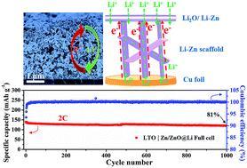 Lithium (Li) metal is regarded as one of the most promising anode candidates for next-generation energy storage systems due to its high theoretical capacity and low operating voltage. However, the growth of lithium dendrites caused by inhomogeneous and uncontrolled Li deposition hinders its practical application. Herein, a 3D porous lithiophilic zinc (Zn) scaffold modified with a thin zinc oxide (ZnO) surface layer on Cu foil (Zn/ZnO/Cu) as a current collector for lithium metal anodes is constructed by magnetron sputtering. The Zn/ZnO scaffold would react with Li+ ions before the deposition of lithium metal, leading to the formation of a Li–Zn alloy scaffold with a Li2O modified layer (Li–Zn/Li2O) on its surface. The surface Li2O layer with high ionic conductivity would passivate the conductive surface and provide a potential gradient across the surface layer and 3D porous Li–Zn alloy scaffold. Consequently, a Zn/ZnO@Li|Li symmetric cell can cycle stably for more than 500 h at 4 mA cm−2 for a total capacity of 1 mA h cm−2 and a low polarization (around 40 mV). Moreover, an ultra-long cycling life with a high capacity retention of 81% after 1000 cycles for a Li4Ti5O12|Zn/ZnO@Li full cell is also realized, showing that the Li–Zn/Li2O porous scaffold on Cu foil has a great prospect as a 3D current collector for Li metal anodes in the future.