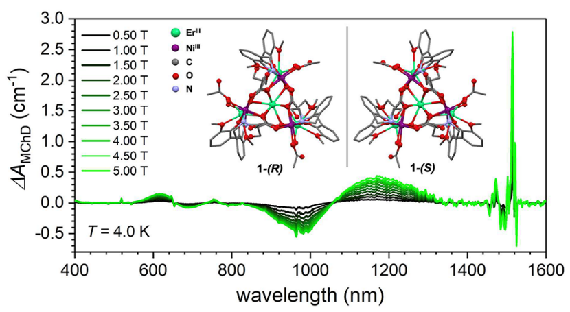 孔祥建课题组近年来在手性稀土团簇的磁光效应方面开展了探索性研究(J. Am. Chem. Soc. 2023, 145, 22176;J. Am. Chem. Soc. 2022, 144, 8837)。基于团队前期报道的[Dy5Ni6]手性团簇体系,提出在磁偶极允许的跃迁中,存在强MChD效应。本工作基于Er3+离子在近红外1520nm的4I15/2—4I13/2磁偶极跃迁,在手性团簇[Er5Ni6]中观测到了超强的MChD响应,在4K下获得了高达0.24 T-1的gMChD。这是迄今为止所获得的最强MChD效应。这些结果证明了磁偶极允许的跃迁在MChD中的关键作用。