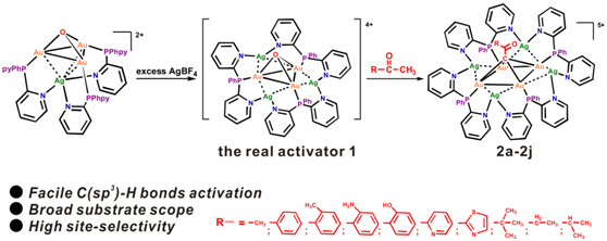 由于sp3 C-H键能高、极性小,其活化特别困难,而实现其温和条件下的活化特别具有挑战性。王泉明课题组利用团簇所具有的特殊反应性,在常温常压下实现了甲基酮的甲基sp3 C-H的活化。所用的团簇为吡啶基膦配体保护的含氧金银团簇[OAu3Ag3(PPhpy2)3](BF4)4 (PPhpy = 双吡啶苯基膦)。研究表明,该团簇可以适用的甲基酮C-H活化的底物范围很广,而且可以将甲基的三个C-H键全部活化。C-H的活化主要是利用了团簇的协同效应,即在金进攻甲基碳的同时,氧离子结合甲基氢形成水分子离去,而银离子的介入有利于提高金对碳的结合。此项研究预示着金属团簇在C-H活化以及相关催化反应中具有不可估量的应用潜力。