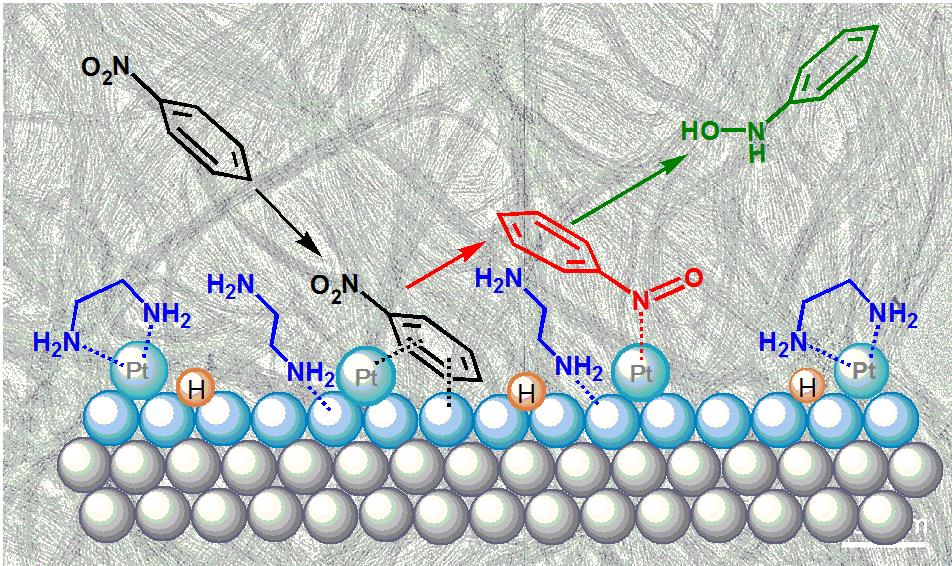 通常认为,硝基苯加氢经历亚硝基苯和羟基苯胺等活泼中间体,最后生成热力学稳定的硝基苯。传统铂催化剂很难将反应停留在中间状态,不利于高选择性得到热力学上不稳定、但却是重要化工中间体的羟基苯胺。理论计算表明,乙二胺修饰铂纳米线表面的Ptd-对硝基苯和亚硝基苯等缺电子底物的吸附有利,但显著抑制了富电子苯基羟胺的吸附。当硝基苯被氢化至苯基羟胺时,会由于静电排斥作用而离开催化剂表面,避免了深度氢化。在深入理解界面电子效应的基础上,他们发现通过在商业铂黑催化剂表面原位沉积铂-乙二胺配合物修饰层,可以极大改善了催化剂对芳香羟胺的催化选择性。该策略简单易行,而且灵活可控,充分展示了配位化学在发展新催化材料中的重要性。