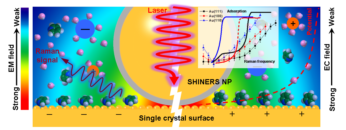 表面增强拉曼光谱(SERS)很难应用于单晶界面研究,而壳层隔绝纳米粒子增强拉曼光谱(SHINERS)技术突破了这一长期瓶颈,并具有极高的表面检测灵敏度和重现性。在该论文中,作者把电化学方法与SHINERS技术相结合,观察了吡啶分子在Au(111)、Au(100)和Au(110)单晶电极表面动态吸附的过程,并系统地研究了晶面效应、浓度效应以及电位效应。同时,作者还首次观察到了电化学条件下Au(111)表面第二层吡啶分子的相变过程。文中的电化学结果和SHINERS实验数据能够非常完美地吻合,这表明电化学SHINERS技术在表征单晶表面物种和监测界面催化反应过程中具有极大的潜力。该方法有望被更广泛地应用于表面科学、电化学、催化等领域。