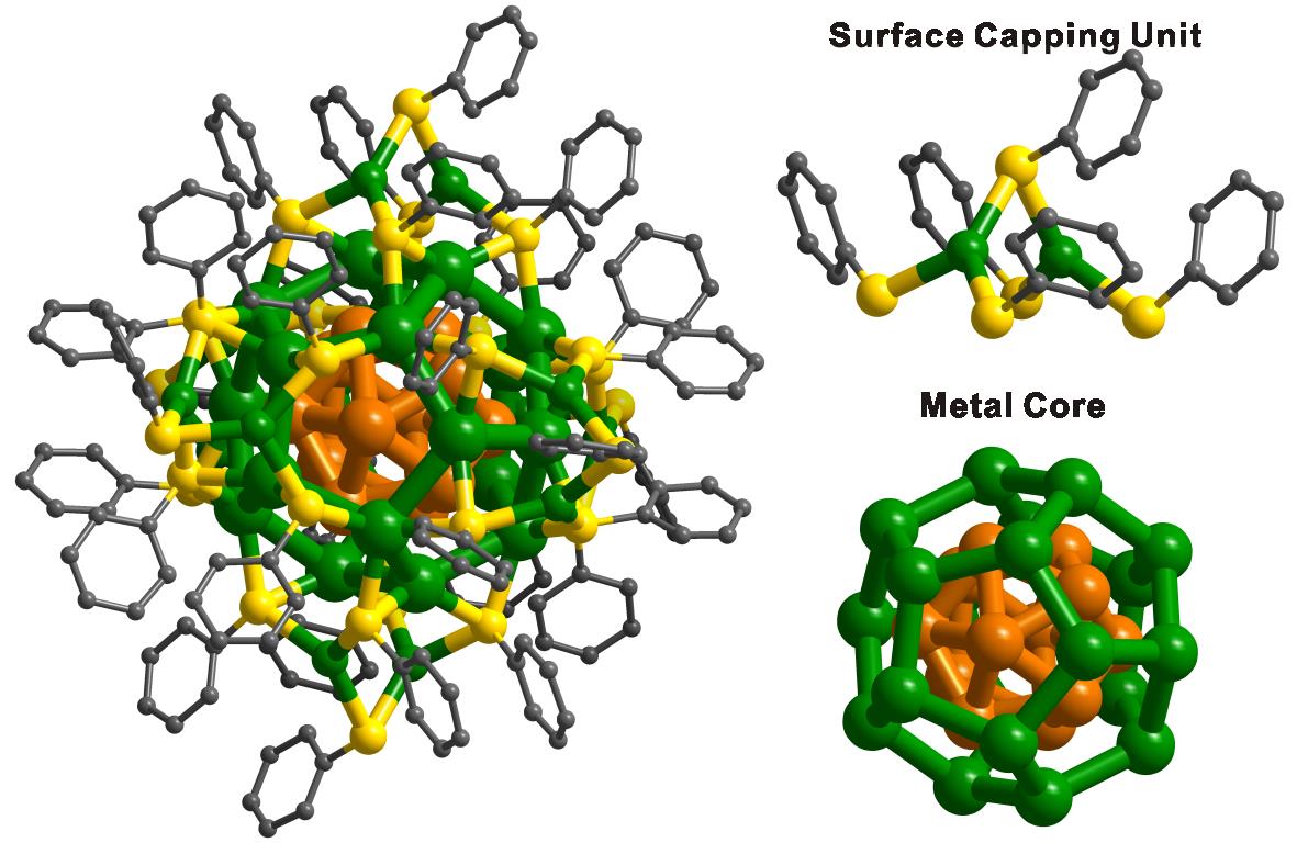硫醇保护的金属颗粒由于其良好的稳定性一直是近二十年化学家关注的热点。2007年以来,国际上在金纳米团簇的结构表征方面取得了显著的进展,对金纳米材料的表界面调控起到了积极的推动作用,然而与其相对应的硫醇保护的银纳米团簇结构真面目一直未被揭开。针对这一问题,郑南峰课题组以含氟硫醇为保护配体合成出了一系列(六成员)尺寸为1.5 nm、硫醇稳定的Ag和AuAg合金纳米团簇,并通过X-射线衍射技术表征了它们的晶体结构,发现该系列纳米团簇的分子组成为[M12Ag32(SR)30]4-(M = Ag, Au),其中硫醇可以是3,4-二氟苯硫酚,对氟苯硫酚,对三氟甲基苯硫酚。这一系列团簇具核壳结构,其金属内核M12Ag20多面体具同轴高对称性的开普勒结构,由一个空心M12 (M = Ag, Au)二十面体内嵌于一个Ag20十二面体形成,而在M12Ag20多面体的表面是由六个Ag2(SR)5结构单元组成的表面保护层。与目前已报道的硫醇保护的Au纳米团簇的结构截然不同,该系列含银纳米团簇内核M12空心二十面的出现使内部金属原子的配位数仅为10而非常规的12,而其表面存在的Ag2(SR)5结构单元完全不同于硫醇保护金纳米团簇的表面所拥有的“订书针”-SR-Au-SR-结构单元,证明了硫醇保护的银纳米颗粒完全有可能拥有与硫醇保护的金纳米颗粒完全不同的表面结构。每个Ag44 或Au12Ag32团簇带4个负电荷,通过对[Ag44(SR)30]4-团簇电子结构的理论计算分析,发现团簇所拥有的良好稳定性可由18电子超原子理论解释。而优越的化学稳定性使该系列团簇的放大合成更容易,一锅反应合成10克团簇已被实现。与此同时,所合成的团簇拥有很强的紫外-可见光吸收能力。这些特征均为其在光电领域的应用提供了很好的基础。