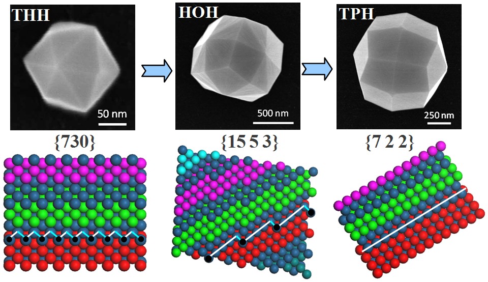 高指数晶面具有低配位的台阶、扭结原子,具有很高的催化活性;但它们同时具有高比表面能,导致合成由高指数晶面围成的铂纳米晶极具挑战性。虽然近年来采用电化学方法和湿化学法已经制备出一系列高指数晶面结构Pt、Pd和Au纳米晶,包括二十四面体(THH),偏方三八面体(TPH)和三八面体(TOH)等形状,但形状最为复杂的凸四十八面体(HOH)尚未能成功制备。凸四十八面体由{hkl}晶面围成,不但表面原子配位数极低(CN=6),而且具有手性结构。