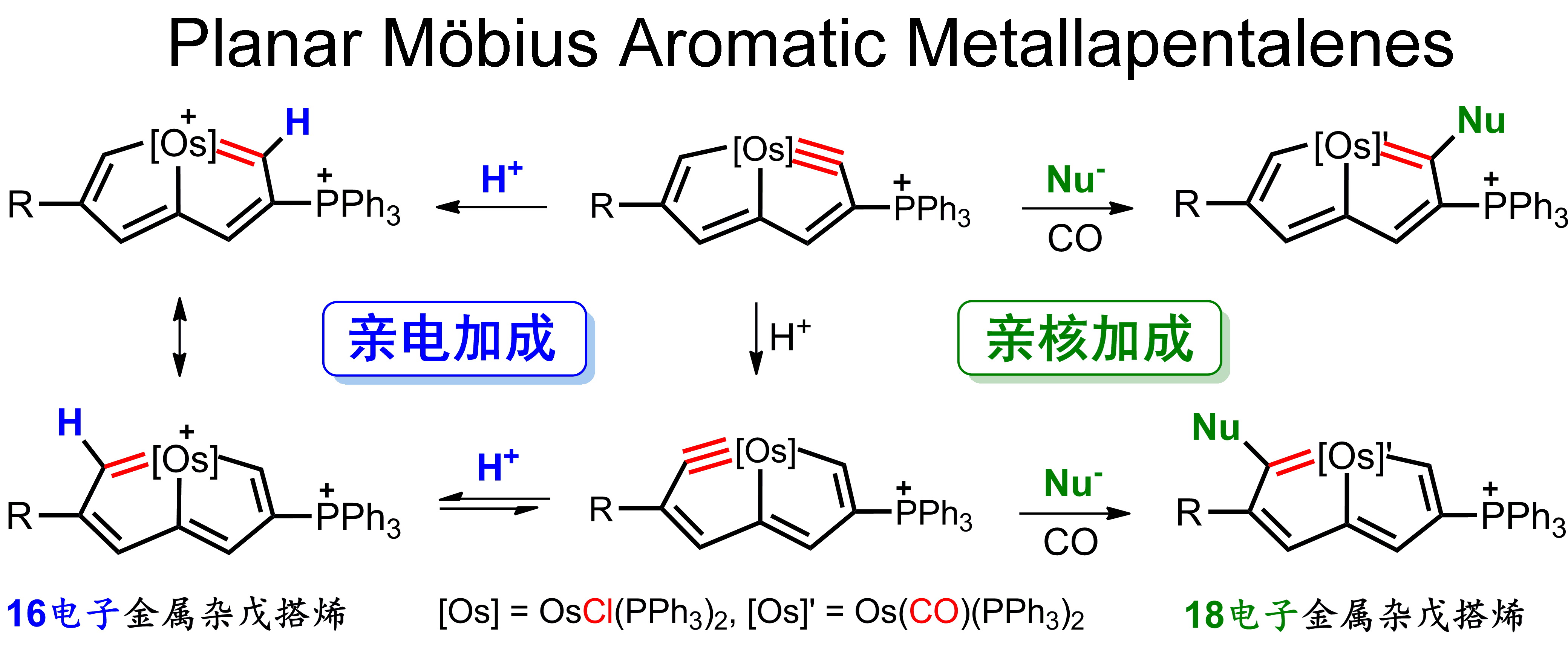 朱军课题组通过理论计算,对金属杂戊搭烯进行深入理论研究。发现金属中心16电子、18电子金属杂戊搭烯均具有芳香性。深入的CMO-NICS计算表明,本质上,金属杂戊搭炔中Mobius芳香性来源于金属杂戊搭烯,正如苯炔的芳香性来源于苯。Mobius芳香性自1958年提出以来,实际合成的例子稀少,且前人已分离并报道的Möbius芳香体系均具有扭曲的拓扑结构。金属杂戊搭烯/炔代表着一类平面型的Möbius芳香性体系。从而颠覆了传统的芳香化学,为构筑其他平面型Möbius芳香体系奠定了基础。