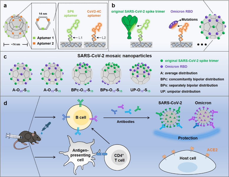 为此,该工作甄选获得了对原始 SARS-CoV-2刺突蛋白(Spike三聚体)和Omicron受体结合域(RBD)具有正交选择性的两种核酸适体,结合可寻址的 DNA 足球框架,精确地操控异质抗原的纳米级间距、化学计量和总体分布;以构建具有平均、双极和单极抗原分布的嵌合纳米颗粒。系统的体内外免疫学研究表明,与双极和单极分布相比,平均分布且比例相等的 30个异质抗原,产生更高含量的广谱中和抗体。此外,利用该策略进行精确组装发现,研究发现纳米颗粒上仅增加 5 个 Omicron RBD 抗原(从15增加至20个)不仅会减少对 Omicron 变异株的中和作用,还会引发过度炎症。该工作突出了异质抗原的比例和空间分布模式在其构效机制中的重要性,为嵌合纳米颗粒疫苗的理性设计提供独特视角和新的科学依据,有望显著推动“下一代”抗病毒疫苗研发进程,为未来突发公共卫生事件奠定科学基础。