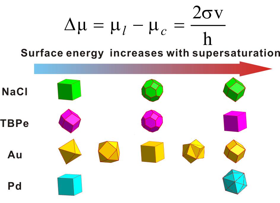 尽管这个领域的研究已有十几年了,人们也已经对微纳米晶体的形貌和表面结构控制提出了各种各样的机理,但大部分机理都只针对少数体系。现在预测和设计合成特定表面结构的微纳米晶体依然十分困难,缺少一种普适的调控裸露晶面的方法。谢兆雄教授与田中群教授合作,以热力学定律为基础,从理论的源头推导出裸露晶面的表面能与晶体生长过程的过饱和度成正比。以此理论为指导设计了离子晶体(NaCl)、分子晶体(TBPe)、金属晶体(Au,Pd)的微纳米晶体生长实验,制备出了一系列具有不同表面能晶面裸露的微纳米晶体,所有实验结果均与预期吻合。该机理还解释大部分已报道的微纳米表面结构控制的实验,具有很好的普适性。该理论可以指导微纳米晶面表面结构的控制合成,促进相关应用领域的发展。