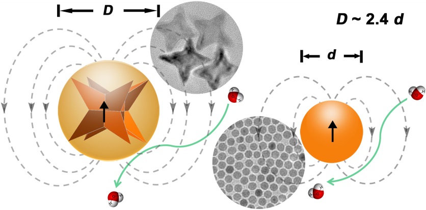高锦豪教授课题组基于这一研究背景,通过氯离子对氧化铁纳米颗粒的形貌合成进行有效控制,得到尺寸均一的内凹八角叉形状Fe3O4纳米颗粒。该类特殊形貌的Fe3O4纳米颗粒体现出很强的T2暗场磁共振造影效果,磁化率值可达679.3 mM-1S-1,是普通球状T2造影材料的5-6倍。进一步研究探明了该内凹八角叉形状氧化铁纳米颗粒提高暗场磁共振成像造影效果的机理:独特的内凹形貌可大幅度提高纳米颗粒的有效直径并增强颗粒周围局域磁场的不均匀性,从而有力提高了暗场磁共振造影能力。该研究不仅开发出一种高性能T2暗场磁共振成像造影剂,更为重要的是为高性能T2暗场磁共振成像造影剂的设计合成开辟了新的思路。
