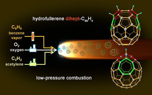 The combustion has long been applied for industrial synthesis of carbon materials such as fullerenes as well as carbon particles (known as carbon black), but the components and structures of the carbon soot are far from being clarified. Herein, we retrieve an unprecedented hydrofullerene C66H4 from a soot of a low-pressure combustion of benzene–acetylene–oxygen. Unambiguously characterized by single-crystal X-ray diffraction, the C66H4 renders a nonclassical geometry incorporating two heptagons and two pairs of fused pentagons in a C2v symmetry. The common vertexes of the fused pentagons are bonded with four hydrogen atoms to convert the hydrogen-linking carbon atoms from sp2 to sp3 hybridization, which together with the adjacent heptagons essentially releases the sp2-bond strains on the abutting-pentagon sites of the diheptagonal fused pentagon C66 (dihept-C66). DFT computations suggest the possibility for an in situ hydrogenation process leading to stabilization of the dihept-C66. In addition, the experiments have been carried out to study heptagon-dependent properties of dihept-C66H4, indicating the key responsibility of the heptagon for changing hydrocarbon activity and electronic properties. The present work with the unprecedented double-heptagon-containing hydrofullerene successfully isolated and identified as one of the low-pressure combustion products shows that the heptagon is a new building block for constructing fullerene products in addition to pentagons and hexagons in low-pressure combustion systems.