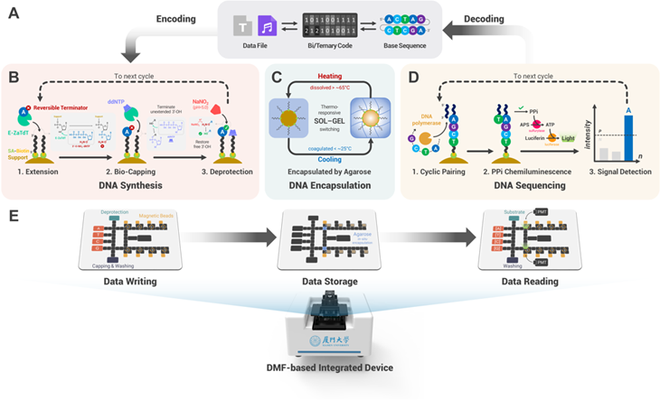 自全球迈入信息化时代以来,信息化浪潮带动了数字经济和人工智能等新兴技术的高速发展,随之而来的是全球数据产出量的爆炸式增长。全球数据量的增加,将远远超出了当前主流存储技术(包括磁性、光学和固态存储)的容量,寻求全新的存储介质与模式成为一个亟待解决的关键问题。脱氧核糖核酸(DNA)因其具有更高的存储密度、更长的保存时间和更低的功耗需求,已经逐渐成为一个备受瞩目的“候选者”,目前DNA信息存储已初步实现信息的写入、存储和解码的完备流程。然而,当前大多数工作依赖于大型DNA商业化的服务或仪器以实现信息写入与读出,这种非连续且非专用的模式使DNA信息存储在更广的实际应用中面临诸多挑战,例如:难以系统性自动化所造成的高读写延时,复杂且昂贵的服务或仪器带来的高准入门槛,以及闭源性分布式处理所导致的高信息安全风险等。