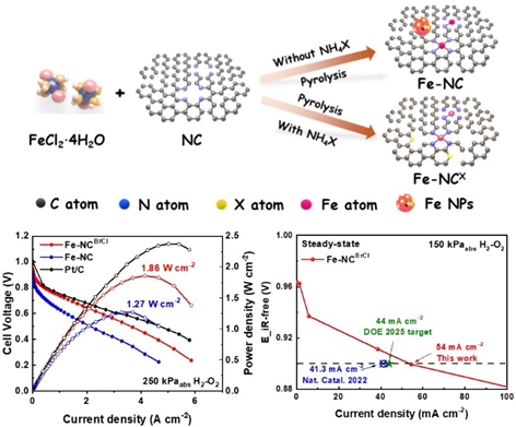 研究团队通过在热解过程中引入NH4Cl和NH4Br,利用其分解产生的NH3和酸性气体HCl、HBr,实现调控碳载体的微观结构和活性位点的化学环境的目的,成功开发出一种高效的Fe-NC催化剂。NH4Cl和NH4Br的高温处理具有三重作用:形成高密度碳缺陷;创造丰富的介孔结构;表面微量溴离子掺杂,这些因素显著提升了Fe-NC催化剂的ORR活性。实验结果表明,表面溴离子的引入使得离子聚合物在催化层表面的分布更加均匀,进而实现了更丰富的三相界面、更快速的氧气传输和界面电荷转移路径。该催化剂(Fe–NCBrCl)的性能超越了美国能源部(DOE)2025年的指标,在氧气和空气环境下分别实现了1.86和0.88 W cm−2的峰值功率密度,并在0.9 ViR-free条件下达到了54 mA cm−2的电流密度。这一成果为在PEMFCs中取代铂基催化剂,最终克服现有PEMFCs的成本障碍提供了可能。