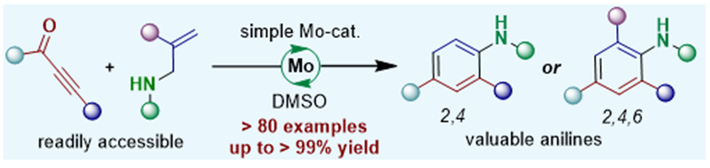 我室卓春祥教授课题组在钼催化的苯胺合成反应中取得重要进展,相关研究成果以“Anilines Formation via Molybdenum-Catalyzed Intermolecular Reaction of Ynones with Allylic Amines” 为题发表于《德国应用化学》(Angew. Chem. Int. Ed. 2024, e202412299)。