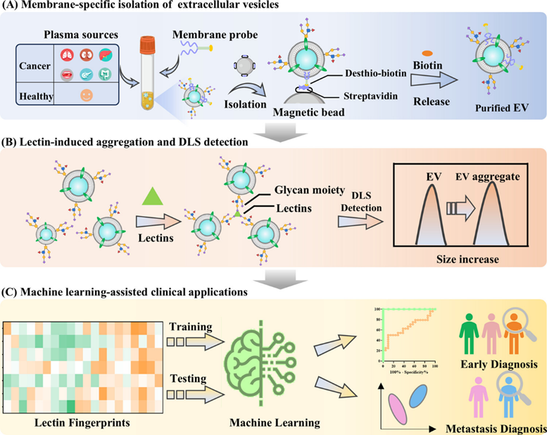 为了应对当前的挑战,朱志教授课题组成功开发了一种膜特异性分离和凝集素诱导EV聚集(MESSAGE)策略,实现了血浆中EV聚糖图谱的快速、高灵敏、选择性分析,并用于结直肠癌(CRC)精准早期诊断、转移监测。首先,该技术采用新型脂质探针对EV进行高效分离,能够获得具有高纯度和生物活性优异的EV;其次,通过凝集素诱导的EV聚集策略,能够将EV聚糖表达转化为动态光散射(DLS)可检测的尺寸信号,进一步提高策略的可拓展性;最后,结合机器学习算法,能够在复杂体液中实现疾病特征的早期检测,并特异性评估癌症的转移情况。这一创新方法不仅为基于EVs的液体活检提供了新的临床特征发现途径,而且显著推动了EVs聚糖研究的深入。此外,它为液体活检技术的发展和临床应用开辟了新的可能性,特别是在癌症的早期诊断和转移监测方面。通过这种方法,可以更精确地识别和监测疾病进展,从而为患者提供更个性化的治疗方案。随着技术的进一步优化和临床验证,预计该策略将在未来的精准医疗领域发挥重要作用。