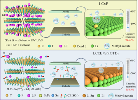 Li/CFx原电池因其超高的理论比能量(2180 Wh/kg)而受到广泛关注。然而,作为该电池体系放电产物之一的氟化锂(LiF),在室温下的电子导电率仅为10-10 S/cm,严重制约了Li/CFx原电池的倍率性能和低温适应性。针对这一问题,杨勇教授课题组聚焦于电解质改性策略,利用Sn(OTf)2添加剂成功调控Li/CFx电池正负极的界面性质,极大改善CFx电极材料的倍率性能,并拓宽了电池的使用温度窗口。Sn(OTf)2添加剂与正极表面放电产物LiF反应,形成具有更高电导性的SnF2,从而增强了正极的电子导电性并降低了放电过程中的极化。因此,CFx材料在该电解质体系中表现出优异的倍率性能和低温性能。此外,Sn(OTf)2中的Sn2+ 还促进了负极表面形成Li-Sn合金,有效保护了锂金属,使得Li/CFx电池在60 oC下的存储时间超过1000小时。该研究工作显著提升Li/CFx原电池在全气候条件下的电化学性能,使Li/CFx原电池能够更好地适应极端环境的应用。