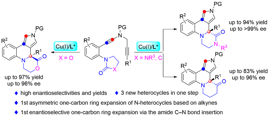 我室叶龙武教授课题组在基于炔烃转化的杂环合成方法学研究方面取得重要进展,相关成果以“Asymmetric one-carbon ring expansion of diverse N-heterocycles via copper-catalyzed diyne cyclization”为题于近日在线发表于Science Advances。