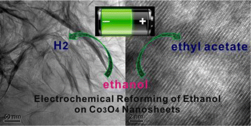 Electrochemical partial reforming of organics provides an alternative strategy to produce valuable organic compounds while generating H2 under mild conditions. In this work, highly selective electrochemical reforming of ethanol into ethyl acetate is successfully achieved by using ultrathin Co3O4 nanosheets with exposed facets as an anode catalyst. Those nanosheets were synthesized by a one-pot, templateless hydrothermal method with the use of ammonia. NH3 was demonstrated critical to the overall formation of ultrathin Co3O4 nanosheets. With abundant active sites on Co3O4 , the as-synthesized ultrathin Co3O4 nanosheets exhibited enhanced electrocatalytic activities toward water and ethanol oxidations in alkaline media. More importantly, over the Co3O4 nanosheets, the electrooxidation from ethanol to ethyl acetate was so selective that no other oxidation products were yielded. With such a high selectivity, an electrolyzer cell using Co3O4 nanosheets as the anode electrocatalyst and Ni–Mo nanopowders as the cathode electrocatalyst has been successfully built for ethanol reforming. The electrolyzer cell was readily driven by a 1.5 V battery to achieve the effective production of both H2 and ethyl acetate. After the bulk electrolysis, about 95% of ethanol was electrochemically reformed into ethyl acetate. This work opens up new opportunities in designing a material system for building unique devices to generate both hydrogen and high-value organics at room temperature by utilizing electric energy from renewable sources.