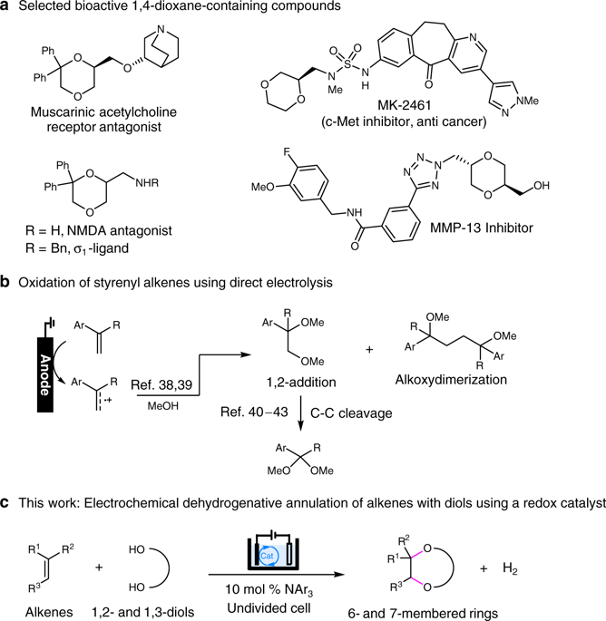 Dehydrogenative annulation reactions are among the most straightforward and efficient approach for the preparation of cyclic structures. However, the applications of this strategy for the synthesis of saturated heterocycles have been rare. In addition, reported dehydrogenative bond-forming reactions commonly employ stoichiometric chemical oxidants, the use of which reduces the sustainability of the synthesis and brings safety and environmental issues. Herein, we report an organocatalyzed electrochemical dehydrogenative annulation reaction of alkenes with 1,2- and 1,3-diols for the synthesis of 1,4-dioxane and 1,4-dioxepane derivatives. The combination of electrochemistry and redox catalysis using an organic catalyst allows the electrosynthesis to proceed under transition metal- and oxidizing reagent-free conditions. In addition, the electrolytic method has a broad substrate scope and is compatible with many common functional groups, providing an efficient and straightforward access to functionalized 1,4-dioxane and 1,4-dioxepane products with diverse substitution patterns.
