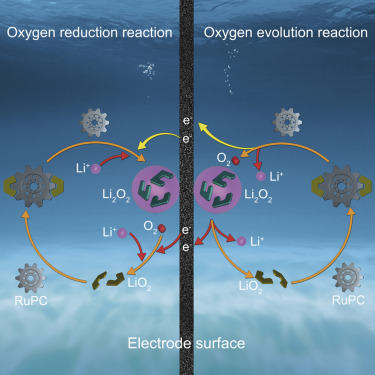 The aprotic lithium-oxygen (Li-O2) battery has attracted worldwide attention because of its ultrahigh theoretical energy density. However, its practical application is critically hindered by cathodepassivation, large polarization, and severe parasitic reactions. Here, we demonstrate an originally designed Ru(II) polypyridyl complex (RuPC) though which the reversible expansion of Li2O2 formation and decomposition can be achieved in Li-O2 batteries. Experimental and theoretical results revealed that the RuPC can not only expand the formation of Li2O2 in electrolyte but also suppress the reactivity of LiO2 intermediate during discharge, thus alleviating the cathode passivation and parasitic reactions significantly. In addition, an initial delithiation pathway can be achieved when charging in turn; thus, the Li2O2 products can be decomposed reversibly with a low overpotential. Consequently, the RuPC-catalyzed Li-O2 batteries exhibited a high discharge capacity, a low charge overpotential, and an ultralong cycle life. This work provides an alternative way of designing the soluble organic catalysts for metal-O2 batteries.