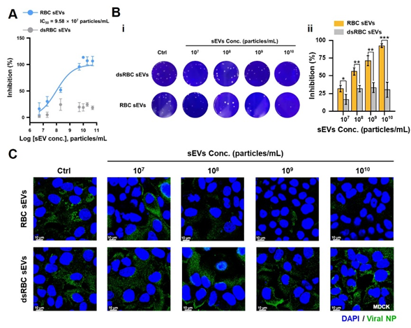 此前,颜晓梅教授课题组建立了细胞外囊泡表面唾液酸的原位化学标记和纳米流式单颗粒水平检测方法,并发现红细胞来源的小细胞外囊泡(red blood cell-derived small extracellular vesicles, RBC sEVs)表面富含唾液酸(Anal. Chem. 2024, 96, 12718−12728)。 基于此,课题组利用RBC sEVs表面的多价唾液酸与流感病毒紧密结合,充当“纳米诱饵”,从而有效阻断病毒对宿主细胞的粘附和感染。首先,通过液相芯片实验验证了RBC sEVs以唾液酸浓度依赖的方式与流感病毒发生结合。去除唾液酸的RBC sEVs(dsRBC sEVs)与病毒的结合能力显著降低,进一步证明了唾液酸在此过程中发挥了关键作用。此外,只有保留完整唾液酸的 RBC sEVs能有效阻断流感病毒对宿主细胞的粘附,并抑制其引起的血凝现象。进一步实验表明,RBC sEVs通过其表面唾液酸,不仅能在病毒感染初期阻断病毒入侵,还能在病毒侵染宿主细胞后持续抑制感染,展现出多阶段抑制病毒感染的潜力。此项发现为应对流感等病毒性疾病提供了一种全新的天然抗病毒策略。相比人工合成的纳米材料,RBC sEVs 具有优异的生物相容性和广泛的应用前景。