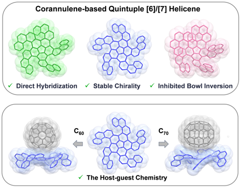 近日,我室谢素原院士课题组的张前炎教授在碗状五重螺烯分子研究方面取得新进展,相关成果以“Corannulene-based Quintuple [6]/[7]helicenes: Well-preserved Bowl Core, Inhibited Bowl Inversion and Supramolecular Assembly with Fullerenes”为题, 发表于Angew. Chem. Int. Ed.(Doi: 10.1002/anie.202417269)。