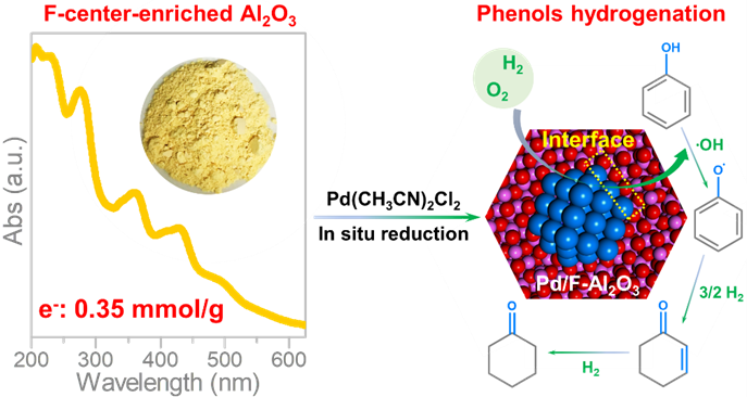 氧化铝是一种广泛应用于催化领域的载体材料,作为一种难还原氧化物,其电子缺陷的构筑及其应用尚未得到深入研究。研究团队在近期工作基础上(Chem. Sci. 2024, 15, 3140;Sci. China Chem. 2024. DOI: 10.1007/s11426-024-2260-2),通过在惰性气氛下煅烧氧化铝前驱体(碱式乙酸铝),成功制备出富F-center(含自由电子的氧空位)的黄色非晶态氧化铝(F-Al2O3),其表面电子密度达~0.35 mmol·g-1。这些位于氧空位的电子可还原Pd前驱体,形成具有丰富界面的超小Pd纳米颗粒。Pd/F-Al2O3催化剂在苯酚加氢反应中表现出优异的性能,在常温常压下即可实现苯酚高活性、高选择性转化为环己酮。实验与理论计算研究表明,加氢反应中少量残余空气中的O2可在Pd-F-Al2O3界面处生成羟基自由基,助力苯酚高效活化,而所生成的苯酚自由基在Pd位点则逐步加氢得到目标产物环己酮。该研究为新型富电子缺陷的难还原氧化物的合成与研究,以及选择性加氢催化剂的设计和构筑提供了新思路。
