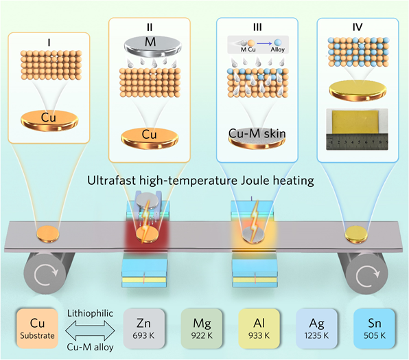 为此,研究团队设计和开发了一种两步超快高温焦耳热新方法,成功实现了具有亲锂性Cu-Zn合金“皮肤”层集流体的规模化制备。该方法首先通过低功率加热在铜集流体表面原位生成Cu5Zn8金属间化合物,然后利用高功率脉冲加热将其转化为纳米级厚度的Cu0.64Zn0.36亲锂“皮肤”层。这种简便高效的制备工艺展现出优异的连续化生产潜力。通过系统的原位/非原位表征结合理论计算研究表明,所构建的Cu0.64Zn0.36亲锂层能够有效促进锂离子均匀输运,显著降低锂成核势垒,并大幅提升对锂的润湿性。基于该亲锂层修饰的Cu集流体(Cu@Cu0.64Zn0.36)在Li||Cu半电池体系中表现出优异的库伦效率,与LFP、NCM90等正极材料匹配的全电池也展现出优越的循环稳定性。值得注意的是,该方法具有良好的普适性,可扩展应用于多种Cu-M(M为Sn、Ag、Al、Mg等)合金层的可控制备,为构建高性能亲锂集流体提供了一种简便、高效的通用策略。这项研究不仅为下一代高能量密度锂金属电池集流体的规模化制备提供了切实可行的解决方案,同时也为其它碱金属电池体系及功能电极材料的结构优化与性能提升开辟了新的研究思路。