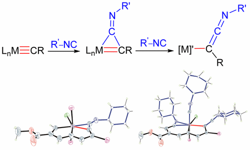 η2-Iminoketenyl species have often been postulated as the intermediates in nucleophile-induced carbyne–isocyanide C–C coupling processes. However, such species are elusive. Here we report direct formation of η2-iminoketenyl complexes from reactions of metallapentalyne with isocyanides. Our studies show that steric effects of N-substituents of the isocyanides play an important role in the stability of the three-membered metallacycles of the η2-iminoketenyl complexes. Sterically bulky isocyanides, such as tert-butyl or 1-adamantyl isocyanides, inhibit bending at the iocyanide nitrogen atoms, a requirement for formation of η2-iminoketenyl structures. Reactions of metallapentalyne with excess isocyanide allow the metal-bridged metallaindene derivativesto be isolated as a result of the isocyanide insertion into the M–Cα σ bond of metallapentalyne.