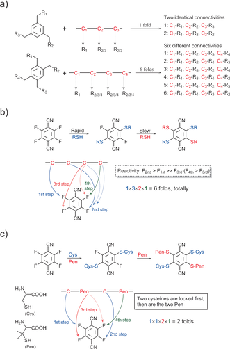 We report the discovery of a small phenyl molecule with four isosteric thiolate-reactive groups of sequentially varied reactivity. This molecule was exploited in combination with cysteine/penicillamine thiolates of different nucleophilic reactivity for precisely regulated and efficient locking (PROP-locking) of linear peptides into multicyclic topologies through a one-pot reaction. The PROP-locking relies on multistep and sequential thiolate/fluorine nucleophilic substitutions, which is not only rapid but highly specific, thus enabling rapid locking of peptides with high amino acid diversities without protecting groups. Several tricyclic peptide templates and bioactive peptides were designed and synthesized using the PROP-locking strategy. We believe that tricyclic peptides precisely locked through stable thioether bonds should be promising structurally constrained scaffolds for developing potential therapeutics and target ligands.