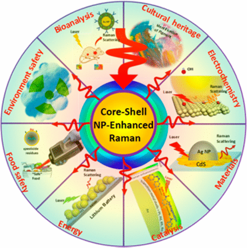 Core–shell nanoparticles are at the leading edge of the hot research topics and offer a wide range of applications in optics, biomedicine, environmental science, materials, catalysis, energy, and so forth, due to their excellent properties such as versatility, tunability, and stability. They have attracted enormous interest attributed to their dramatically tunable physicochemical features. Plasmonic core–shell nanomaterials are extensively used in surface-enhanced vibrational spectroscopies, in particular, surface-enhanced Raman spectroscopy (SERS), due to the unique localized surface plasmon resonance (LSPR) property. This review provides a comprehensive overview of core–shell nanoparticles in the context of fundamental and application aspects of SERS and discusses numerous classes of core–shell nanoparticles with their unique strategies and functions. Further, herein we also introduce the concept of shell-isolated nanoparticle-enhanced Raman spectroscopy (SHINERS) in detail because it overcomes the long-standing limitations of material and morphology generality encountered in traditional SERS. We then explain the SERS-enhancement mechanism with core–shell nanoparticles, as well as three generations of SERS hotspots for surface analysis of materials. To provide a clear view for readers, we summarize various approaches for the synthesis of core–shell nanoparticles and their applications in SERS, such as electrochemistry, bioanalysis, food safety, environmental safety, cultural heritage, materials, catalysis, and energy storage and conversion. Finally, we exemplify about the future developments in new core–shell nanomaterials with different functionalities for SERS and other surface-enhanced spectroscopies.
