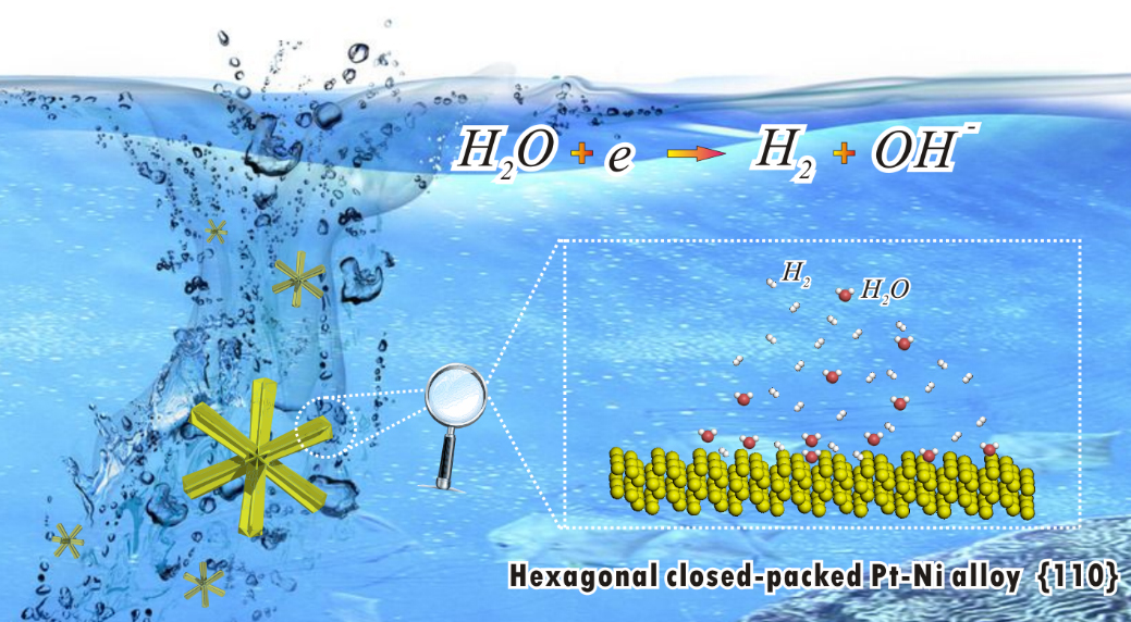 铂镍合金在氢析出(HER)、氧还原(ORR)等重要能量转化反应中具有优异催化性质,受到了人们广泛的关注。铂镍合金在常温常压下是以能量最低的面心立方晶系存在,对于非立方晶系铂镍合金的可控合成及其相关的构效关系研究一直是科研工作者未能实现的目标。近日,谢兆雄教授课题组通过简单的溶剂热方法,首次合成出六方晶系的铂镍合金枝状纳米晶,其中每个枝杈结构由六个{11-20}高能晶面裸露的超薄纳米片组装而成。与面心立方晶系铂镍合金相比,亚稳态的六方晶系铂镍合金在HER反应中表现出更加优异的性质。当电流密度为10 mA·cm-2时,其过电位仅有65 mV,同时质量电流密度高达3.03 mA·µgPt-1 (-70 m V vs. RHE),是目前为止报道的HER催化剂中质量活性最高的,其突出的催化性能主要来源于晶相作用(同质异晶)及大的比表面积。该项工作为发展高催化性能的铂基合金纳米晶提供了新的研究思路。该研究是在谢兆雄教授和蒋亚琪副教授指导下,与我院傅钢教授共同合作完成。实验部分由博士生曹振明(第一作者)、陈巧丽、沈守宇、卢邦安,硕士生李慧齐以及博士后张嘉伟共同完成,理论计算部分由傅钢教授课题组完成。