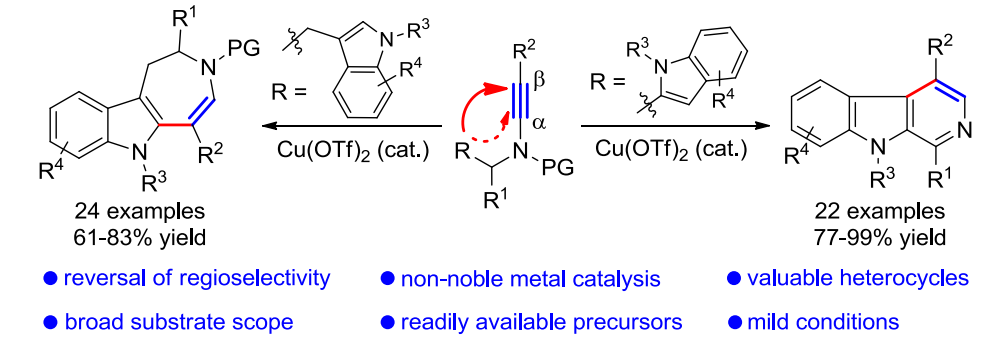 Ynamides are important building blocks in organic synthesis, and an incredible variety of versatile synthetic methods have been developed in the past decade. Among these, catalytic cyclizations of π-tethered ynamides are particularly attractive since this approach enables facile access to a diverse array of synthetically useful nitrogen heterocycles. However, due to the fact that the nitrogen atom is able to impose an electronic bias, these cyclizations exclusively occur on the α position of ynamides. Herein, we report the reversal of regioselectivity in arene-ynamide cyclization by copper catalysis, which represents the first catalytic π-tethered ynamide cyclization involving the reversal of regioselectivity. This strategy allows the expedient and practical synthesis of valuable azepino[4,5-b]indoles and β–carbolines in generally good to excellent yields under exceptionally mild conditions. Moreover, the relevant mechanistic rationale for this novel cyclization, especially for the observed unique regioselectivity, is strongly supported by density functional theory (DFT) calculations. The synthetic utility of this chemistry is also indicated by the synthesis of several biologically active compounds and natural product bauerine A.