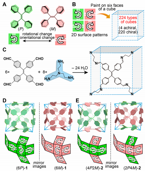 Chiral cage compounds are mainly constructed from chiral precursors or based on the symmetry breaking during coordination-driven self-assembly. Herein, we present an alternative strategy to construct chiral organic cages by restricting the P or M rotational configuration of tetraphenylethylene (TPE) faces through dynamic covalent chemistry. The combination of graph theory, experimental characterizations and theoretical calculations suggests that the emergent chirality of cages is originated from the complex arrangements of TPE faces with different orientational and rotational configurations. Accompanied by the generation of chirality, strong fluorescence also emerged during the cage formation, even in dilute solutions with various solvents. In addition, the circularly polarized luminescence of the cages is realized as a synergy of their dual chiral and fluorescence properties. The chirality and fluorescence of cages are remarkably stable, because the intramolecular flipping of the phenyl rings in TPE faces is extremely restricted, as indicated by theoretical calculations. This study provides insight to construct chiral cages by the rational design through graph theory, and might facilitate the further design of the cages and other supramolecular assemblies from the aggregation-induced emission active building blocks.