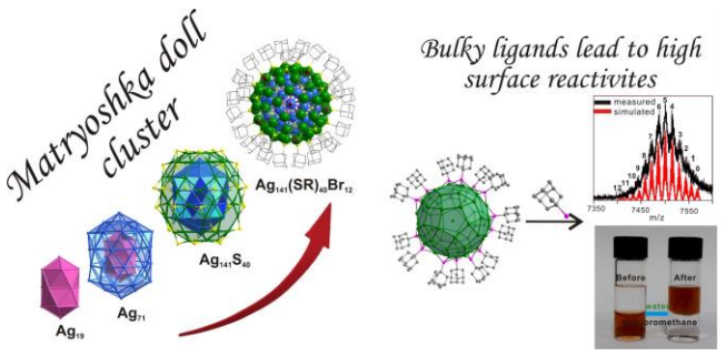 我室郑南峰教授和郑兰荪教授在 JACS 上发表论文:Bulky Surface Ligands Promote Surface Reactivities of [Ag141X12(S-Adm)40]3+ (X=Cl, Br, I) Nanoclusters: Models for Multiple-Twinned Nanoparticles