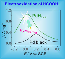 Direct formic acid fuel cells (DFAFCs) are a promising clean power source. To date, palladium (Pd)-based catalysts are the best promising anode catalyst for DFAFCs due to its high anti-poisoning ability and low cost. In this paper, we report a high-efficiency stabe PdHx nanocatalyst towards DFAFCs. The PdHx nanocatalysts are prepared by simply treating the commercial Pd black with n-butylamine at relative low temperature (100 − 200 °C). They are extremely stable, and the as-prepared PdH0.43 nanocatalysts show extremely low overpotential for formic acid electrooxidation, with an oxidation peak potential of 0.04 V versus SCE (saturated calomel electrode). Meanwhile, the PdH0.43 exhibits as high as 3 times mass activity, 5 times specific activity and great catalytic stability, compared with the untreated commercial Pd black. The present strategy offers a convenient way to boost the performance of Pd nanocatalysts in DFAFCs.